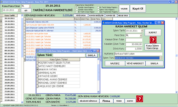 hareketler ve gün sonu kasa mevcudu olarak takibi amacıyla